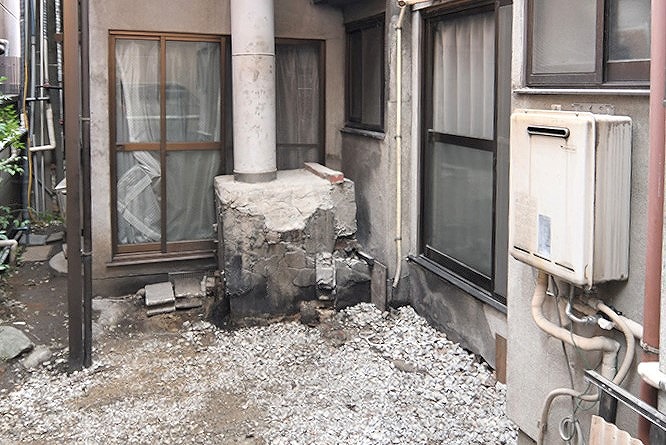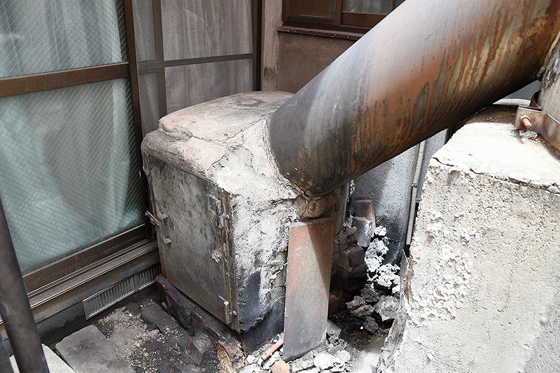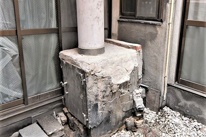 今回は浴場の煙突解体工事を行いました ※なぜ大事な煙突を壊すの? 老朽化で内部にヒビが入り脆くなっていると、 地震等の災害時に倒壊する恐れがあります。 現在はガスでお湯を沸かすことが多く、 煙やススを逃がすための長い煙突が不要になっている場合は 安全のため煙突の形状を変更します