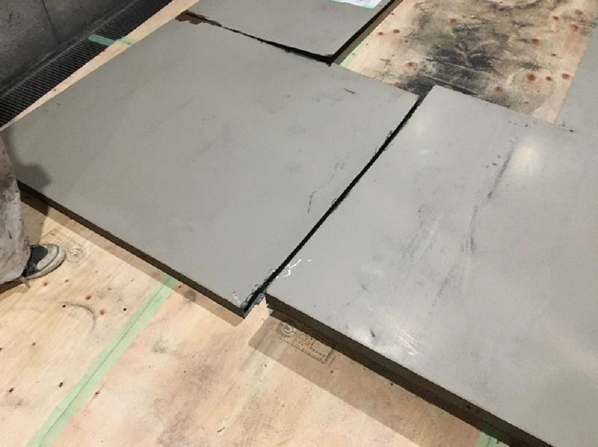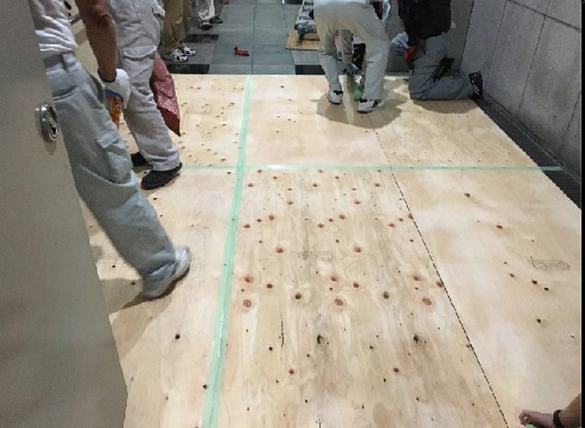 防火扉は大きく、重いので、取り外し・取り付けの際に 床を傷つけないよう入念に養生を施します。