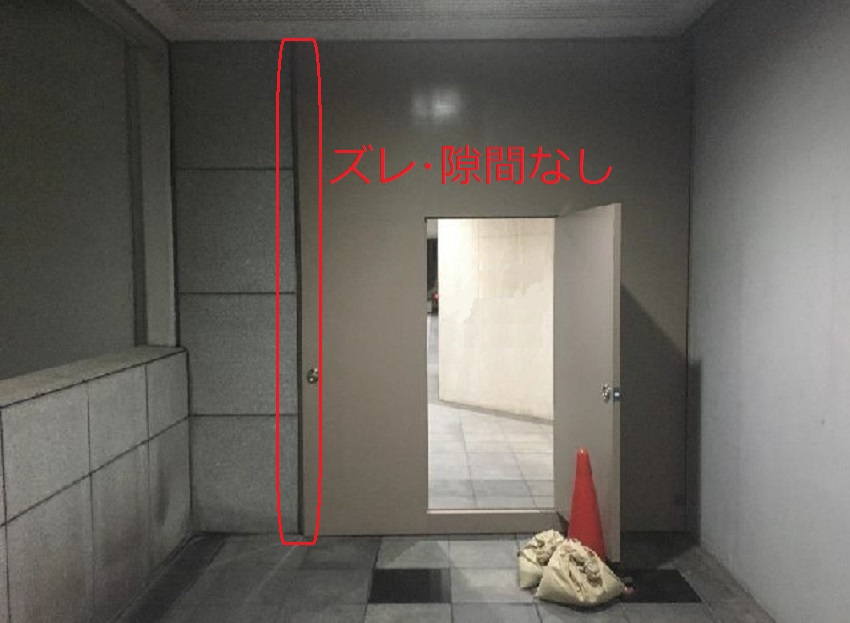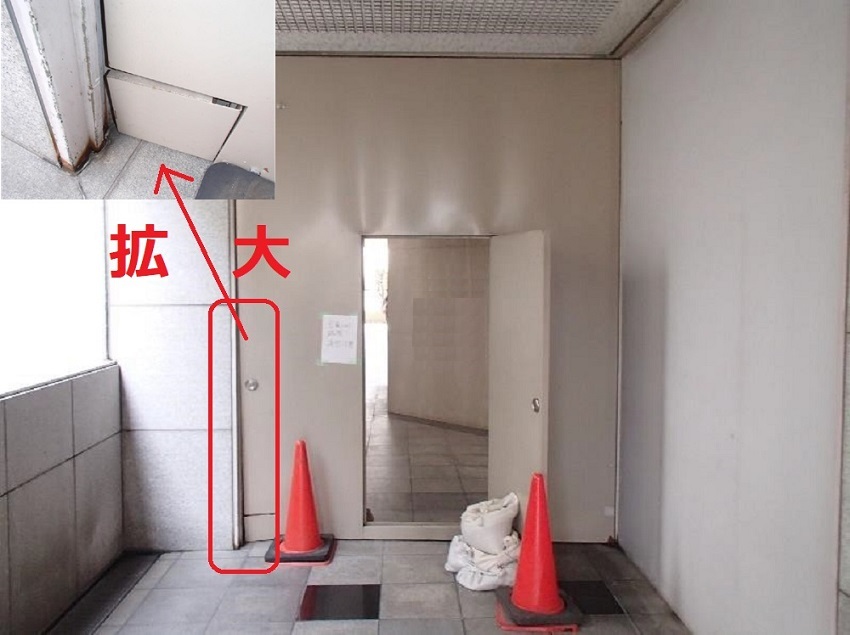 台風で破損した防火扉を交換しました。 昼間は人の往来があり、危険なので、作業は夜に行われました。