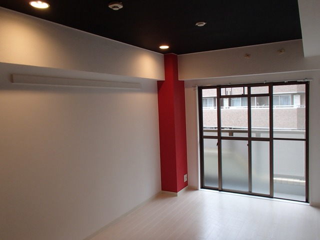 フローリングに変更しました。 ポイントで柱に赤い壁紙を使用しました。 照明も交換しています。
