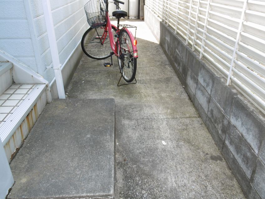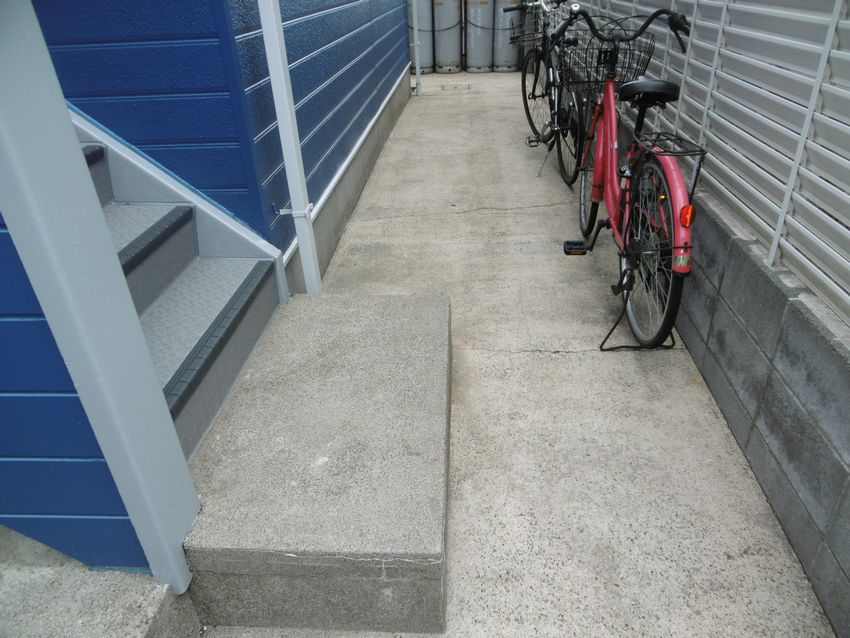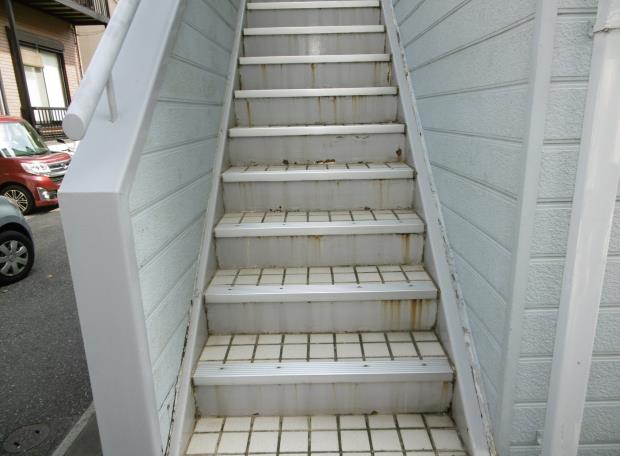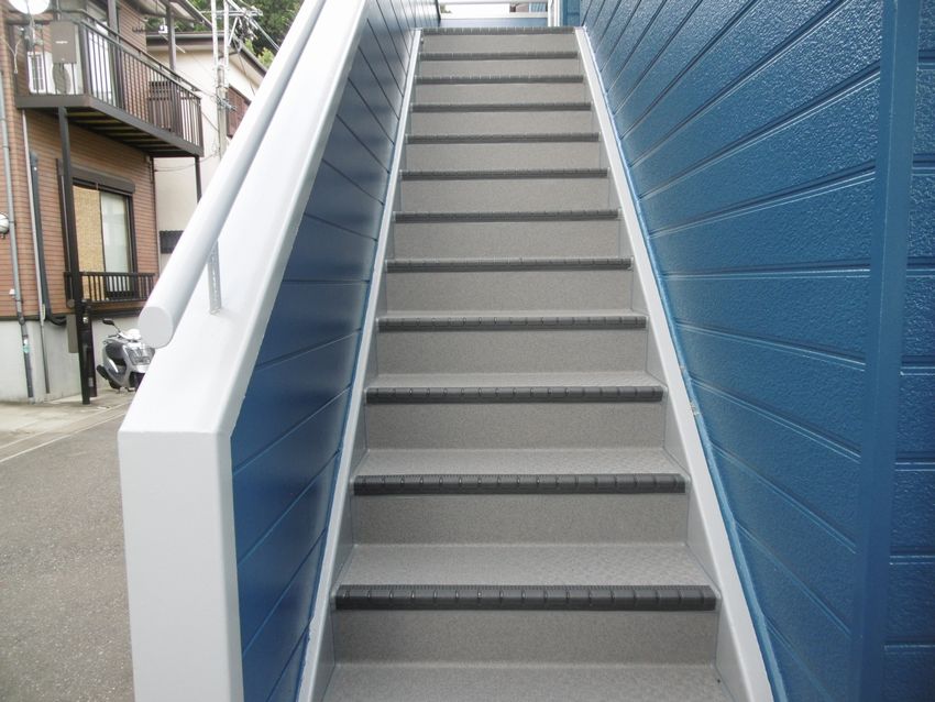 タイルから階段歩行用シートになりました。雨の日も安心ですね。 階段内側のサイディングも張り替えています。