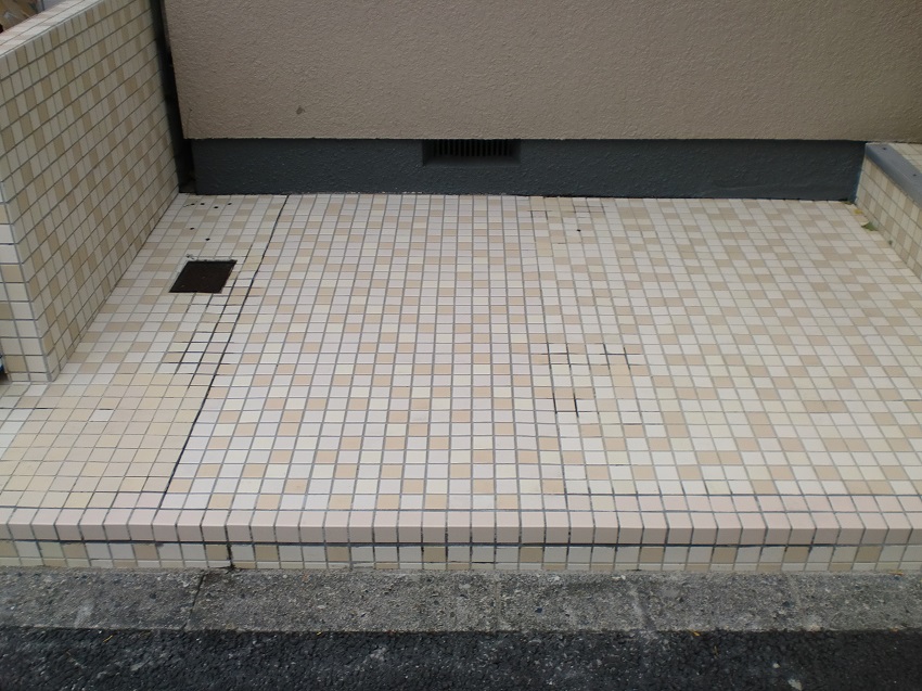 エントランスは改修工事をしました 新築時より設置していたタイルを新しくしたことで、一気に建物の印象が若返りました