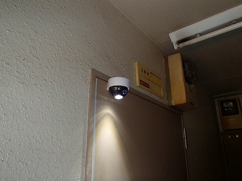 玄関ドアにセンサーライトを取り付けました。 夜間でも、鍵の開閉がスムーズに行えます。 人感センサーによりライトが点灯する為、防犯効果も期待できます。