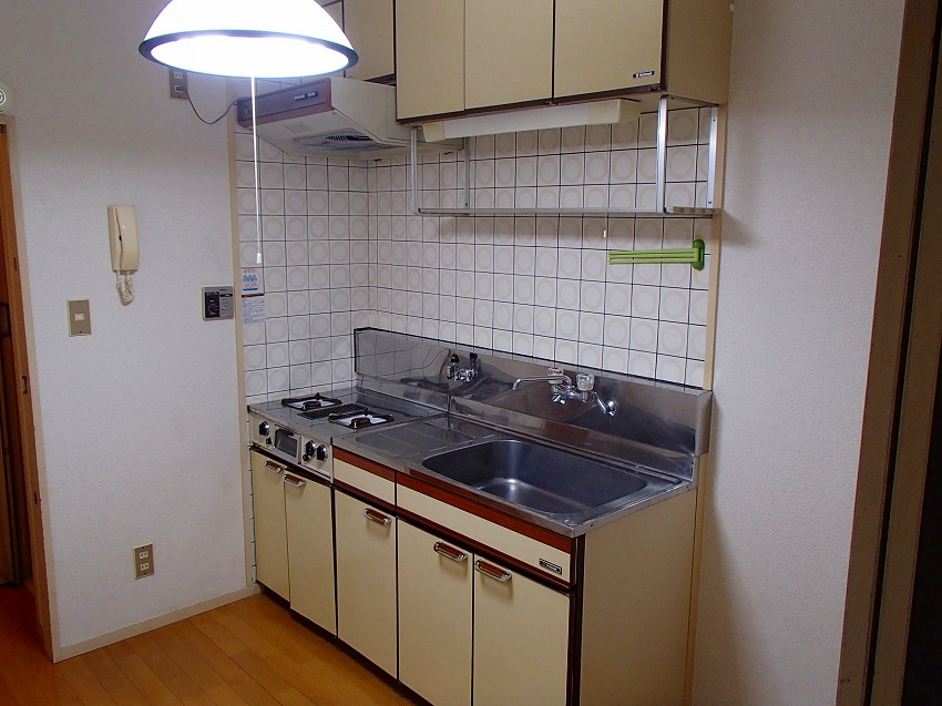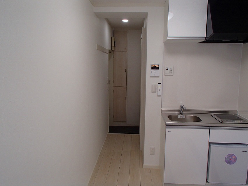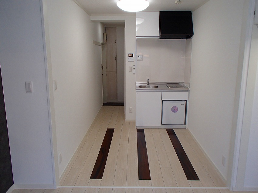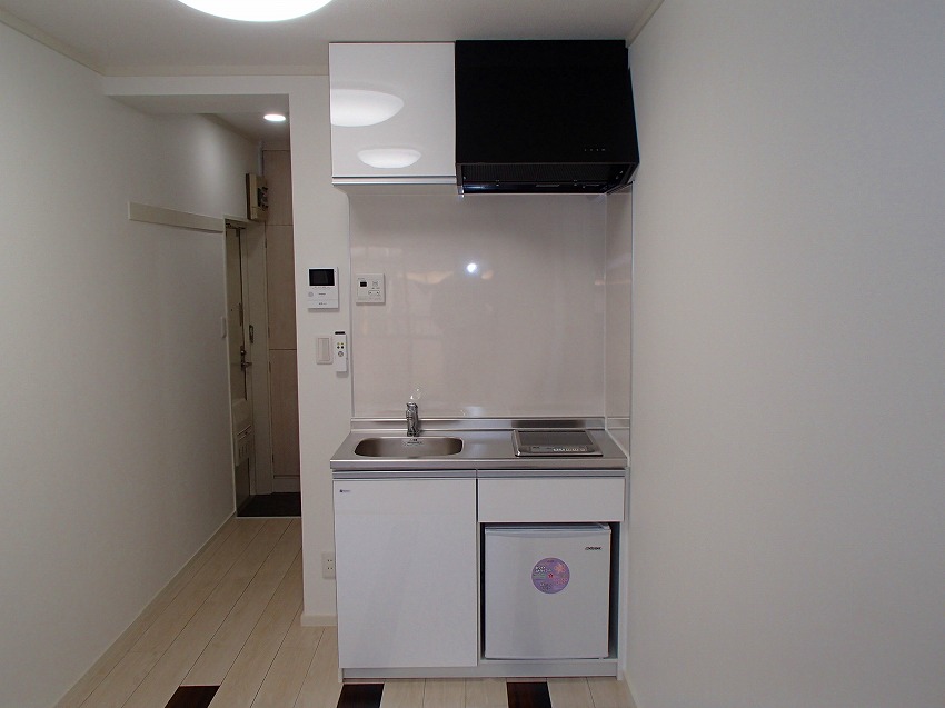 キッチンを交換しました。 キッチンをコンパクト化する事で、居室スペースが広くなりました。 IHコンロのシステムキッチンは、お掃除も簡単です。 水栓金具も、シングルレバーになり、使いやすくなりました。 小型冷蔵庫も設置しています。