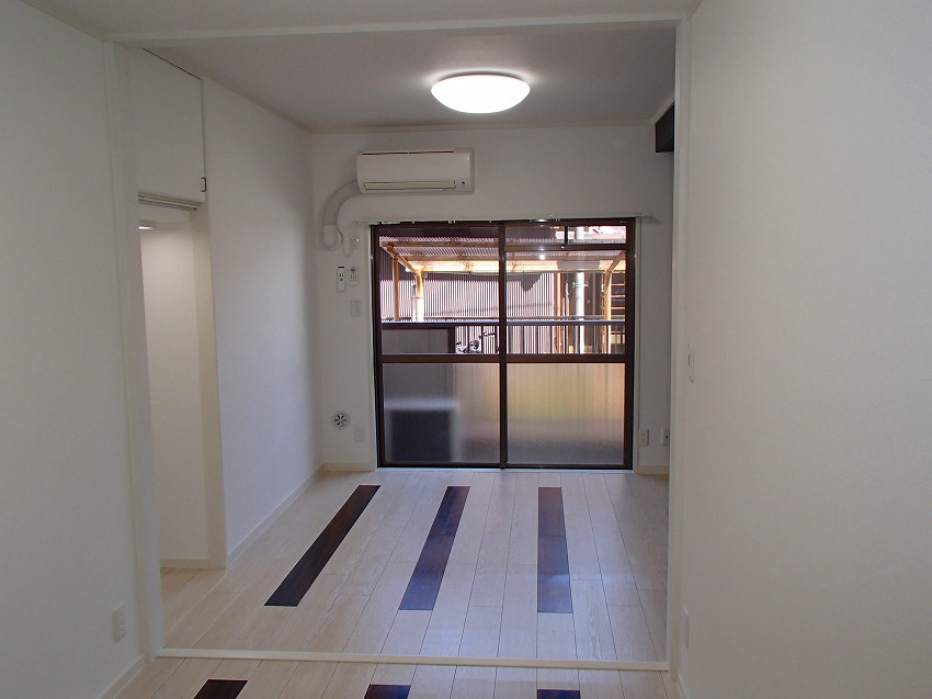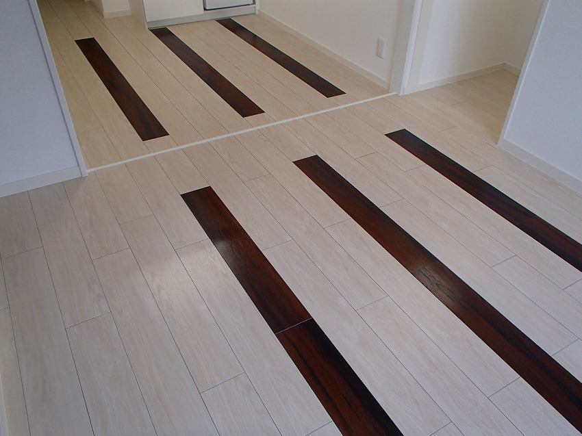 フロアタイルを交換しました。 白に近いカラーを採用したので、室内全体がとても明るく仕上がりました。 対照的なアクセントカラー入れたことで、縦のラインが際立ち、より一層奥行きを感じる事ができます。