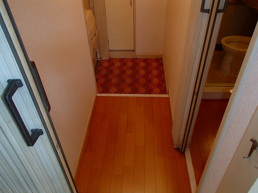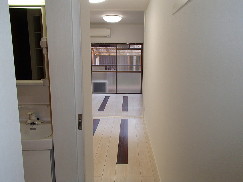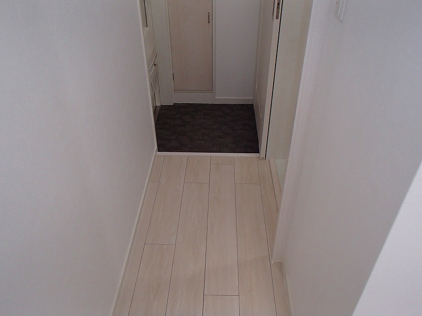 玄関の土間シートを張り替えました。 足元を濃い色にしたことで、壁紙や建具の色を際立たせ、玄関周りが一層明るく感じます。 洗面所のアコーディオンカーテンを撤去し、引き戸を新設しました。 見た目も良く、開口部が広くなった事で、洗面所への出入りも快適になりました。
