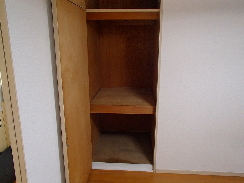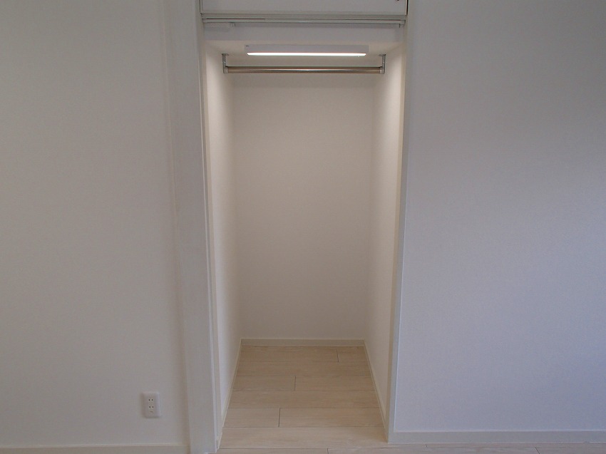 収納扉と上下の仕切りを撤去し、照明とハンガーパイプを設置して、クローゼットに生れま変わりました。 仕切りを撤去した事により、丈の長い洋服や用具を収納する事ができるようになりました。 上部にはカーテンレールが設置されているので、お好きなデザインのカーテンを取り付ける事ができます。