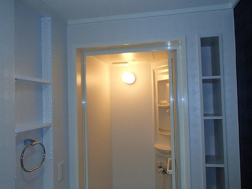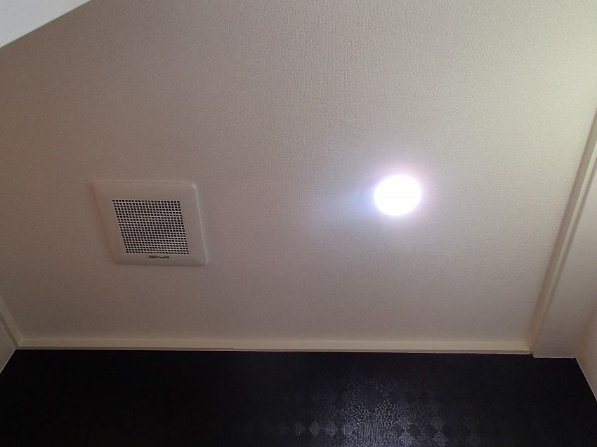 洗面トイレの照明を交換しました。 ボリュームのあるシーリングライトから、ダウンライトへ交換しました。 以前は3点ユニット内にのみに設置していた換気扇を、シャワーユニット内と洗面トイレ内の2ヶ所に設置しました。