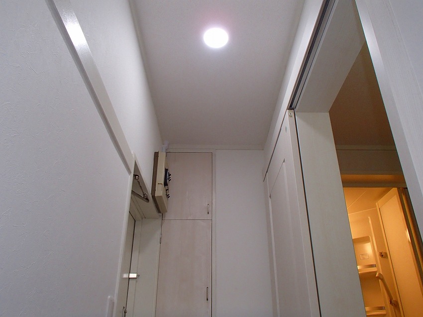 玄関照明を交換しました。 シーリングライト(電球ソケット)を、ダウンライト交換しました。 照明器具の凹凸がなくなりスッキリしたため、空間も広く感じます。 電球はLEDを使用しています。
