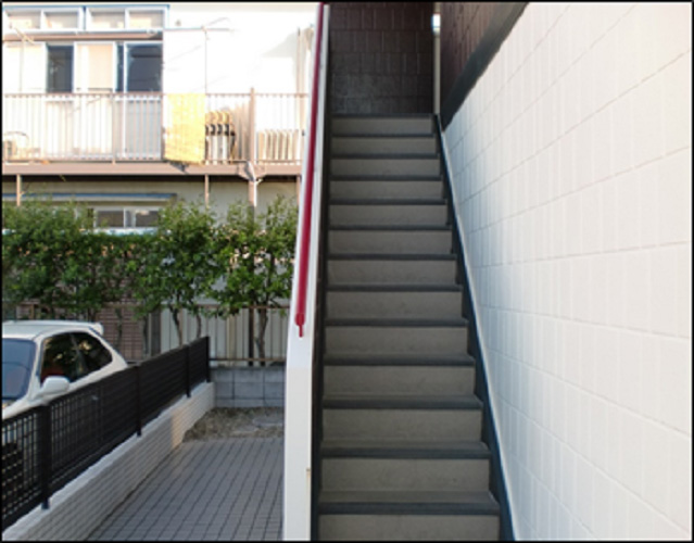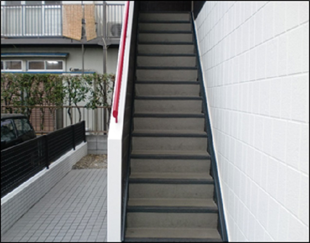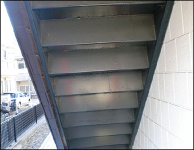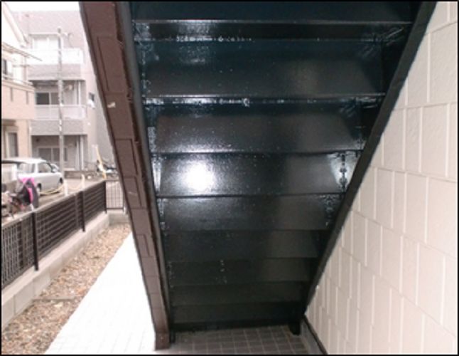 鉄部塗装とシートの洗浄を行いました 見た目がきれいになったことに加え、 階段で入居者の方が滑りにくくなる効果もあります!