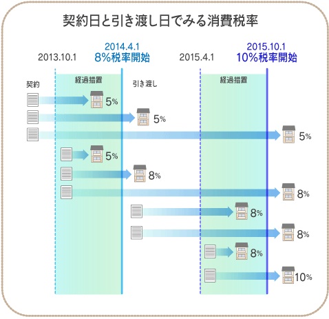 2013年10月1日から2014年3月31日までに契約を締結した場合、3月31日までに引き渡しが行われた物件は消費税率5%、引き渡しが4月1日以降の物件は8%となります。