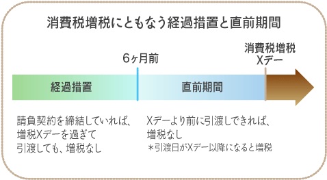 「経過措置」は、建築の請負契約が消費税増税のスタート日から半年前までの期間です。この期間に請負契約が締結していれば消費税は旧税率で計算され、税率が上がってから完成・引き渡しになっても、増税分は加算されません。