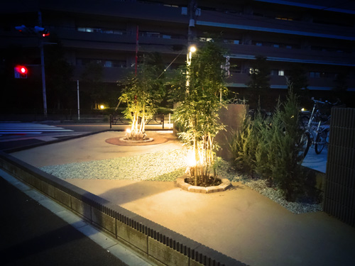 こちらには、あらたにライトを埋め込みました。夜になると、このようにライトアップされます。