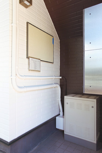 古いポストを撤去し、コンパクトな集合ポストを設置しました。さらに、空いたスペースに掲示板を設置しています。
