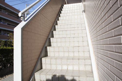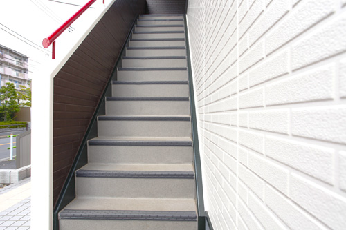 階段のタイルを張り替え、あらたに滑り止めのシートを張りました。外壁も塗り替え、新築のようにキレイですっきりとした階段になりました。