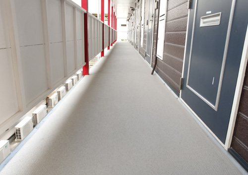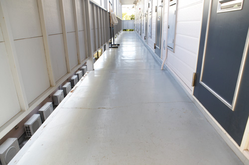 2階通路とフェンスを塗り替えました。外観に合わせて支柱には赤色を採り入れています。