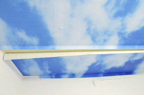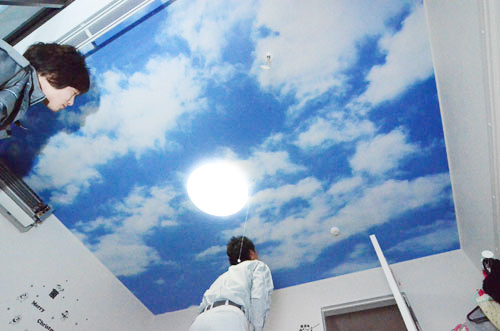 青い空と白い雲。どんな天井になるのでしょうか、施工の様子をご覧ください。