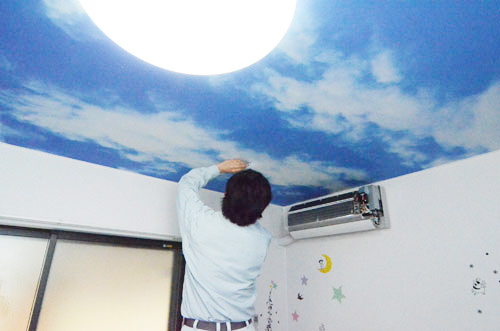 天井への施工は壁面に比べるとやはり難しく、特に絵柄をピッタリと合わせるところに多少ワザが必要です。