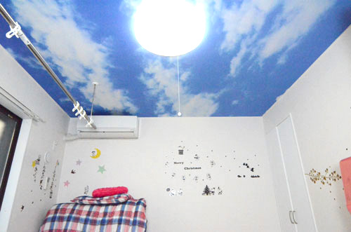 天井への壁紙はあまりないケースでしたので多少心配もありましたが、できあがってみるとまわりの白い壁とのコントラストもぴったりで、明るい部屋になりました。
