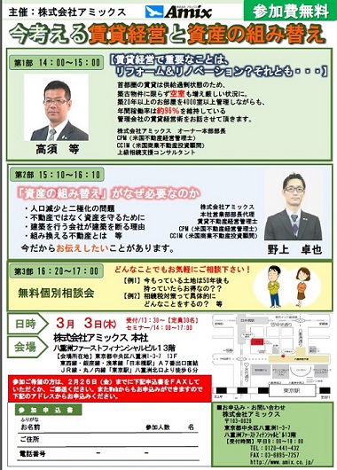 投稿時間 : 2016年02月22日 10:48アミックスでは、3月3日(木)に「今考える賃貸経営と資産の組み替え」と題したオーナー様向けセミナーを開催いたします。
