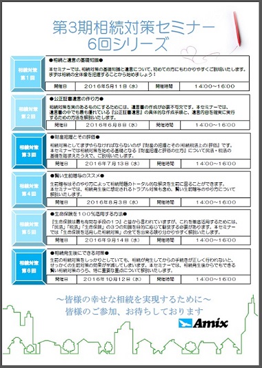 投稿時間 : 2016年04月06日 15:29円満な相続実現にむけて、講師がわかりやすく解説する「相続対策セミナー」。一昨年から第1期・第2期が行われ、多くのみなさまにご好評をいただきました。今年5月より第3期(6回シリーズ)を開催いたします。