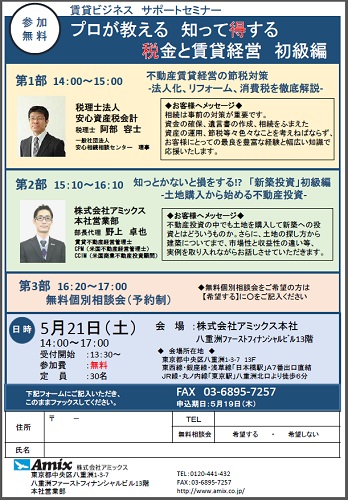 投稿時間 : 2016年04月25日 17:45アミックスでは、5月21日(土)に「プロが教える得知ってする税金と賃貸経営(初級編)」と題したセミナーを開催いたします。
