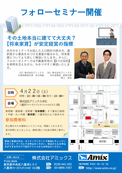 人口減少時代を迎える今、土地の“将来性”を正しく判断することは大変重要です。そこで、コンサルティングセミナーでお話しした内容をさらにくわしくご紹介するため、今週末の4月22日(土)、アミックス本社において「フォローセミナー」を開催いたします。