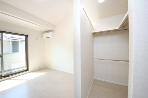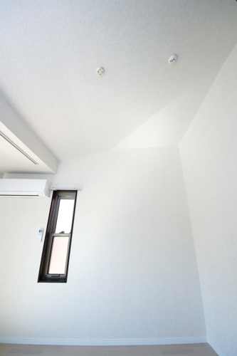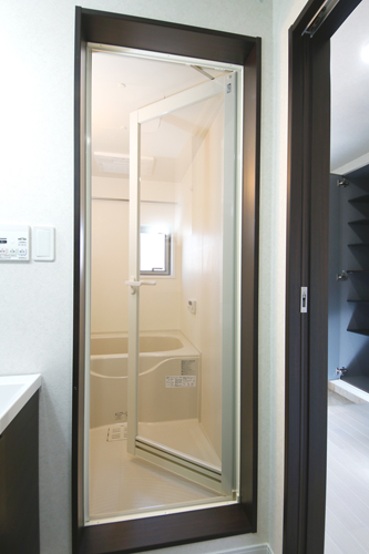 どうしても狭く感じてしまうバスルームには開放感を感じさせるクリアな扉を採用しています。また2階の居室は、空間の広がりを演出する勾配天井(傾きのある天井)となっています。