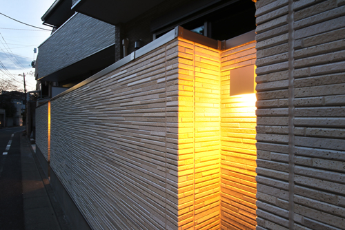 夜間は、オレンジ色のライトアップが帰る人をやわらかく迎えてくれます。我が家に帰ったとほっとするような気持ちになってもらえるのではないでしょうか。植栽の影が壁に映り込む様子も面白いですね。