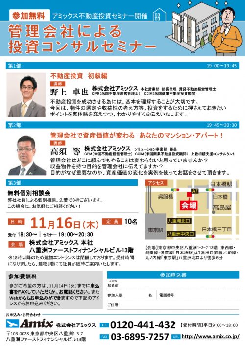 投稿時間 : 2017年11月08日 17:3411月16日(木)に「管理会社による投資コンサルセミナー」を開催いたします。