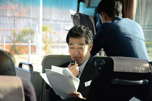 その後、建物についての質問をお伺いしながら、社内の見学となりました。見学終了後は、3台のバスで建物見学ツアーへ出発です。