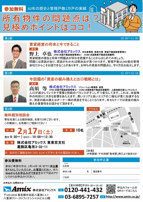 投稿時間 : 2018年02月05日 15:022月17日(土)、アミックス東東京支社にて不動産オーナー様向けのセミナーを開催いたします。