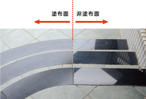左側が塗布面です。よく見ると表面が細かい粒状になっているのがわかります。実際に昇り降りをすると、高い滑り止め効果を実感できます。