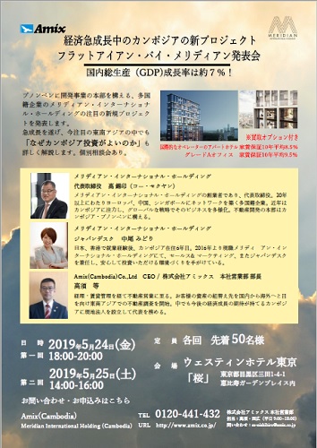 投稿時間 : 2019年04月22日 11:105月24日(金)・25日(土)の2日間、カンボジアの首都プノンペンで進行中のプロジェクト「フラットアイアン・バイ・メリディアン(FLATIRON BY MERIDIAN)」の発表会を開催いたします。