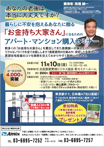 投稿時間 : 2019年10月31日 11:0011月10日(日)、アミックス会長・三光ソフラングループ代表の高橋誠一による不動産投資セミナーが開催されます。