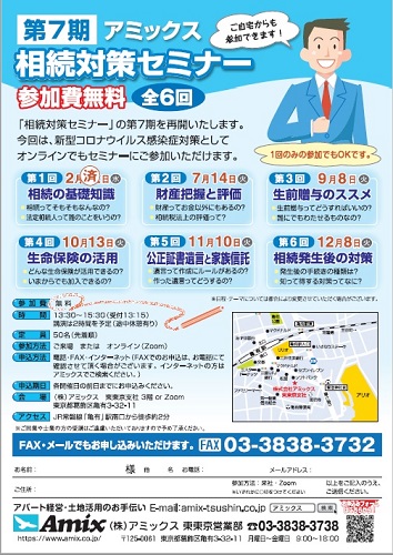 ご好評につき、第7期「相続対策セミナー(全6回)」をアミックス東東京支社(亀有)にて、あらたに開講することとなりました。