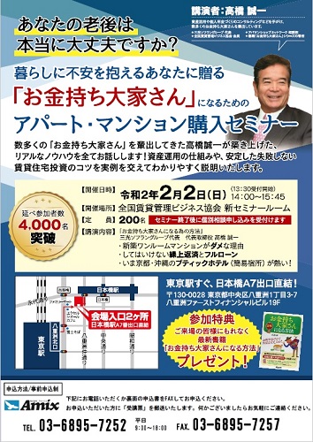 投稿時間 : 2020年01月22日 11:00大好評の不動産投資セミナーが2月2日(日)に行われます。これまで多くの不動産投資を成功させてきたアミックス会長・三光ソフラングループ代表 高橋誠一による講演です。(参加無料)