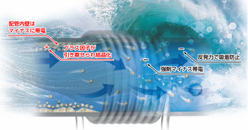 「ナノゲート」は、100Hzから 10,000Hzの周波数で管内に生ずる微弱な交流電磁場が、水に含まれるミネラル分などのプラス因子を一時的にマイナス帯電させ、水流により自然にマイナス帯電する配管内壁と互いに反発する力を産み出します。この特性を得た水が施設内の配管に隈なく流れることで、水アカの固着防止、黒サビによる赤サビのコーティングなど、衛生改善が可能となります。