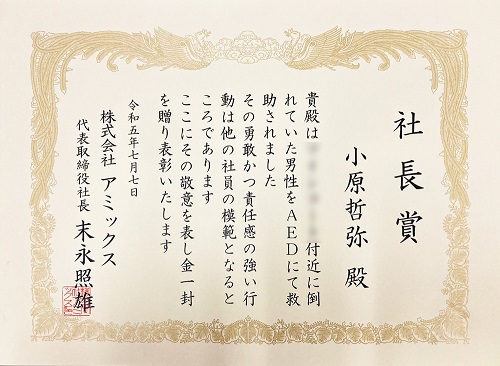 のちに葛西消防署から表彰状が贈られ、社内でも功績に対して表彰を行いました。