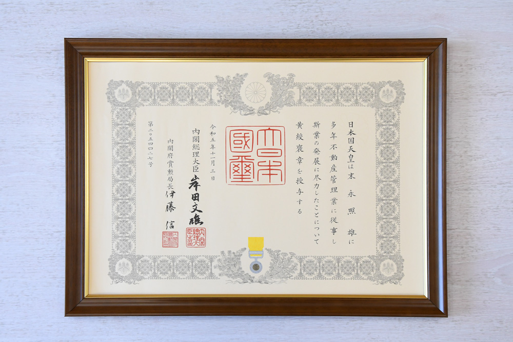 これは、長年にわたる不動産業界での末永個人の活動に加え、2016年から6年間会長をつとめていた公益財団法人 日本賃貸住宅管理協会(以下、日管協)での活動が功績として認められたものです。不動産管理業界としてはじめての受章となりました。