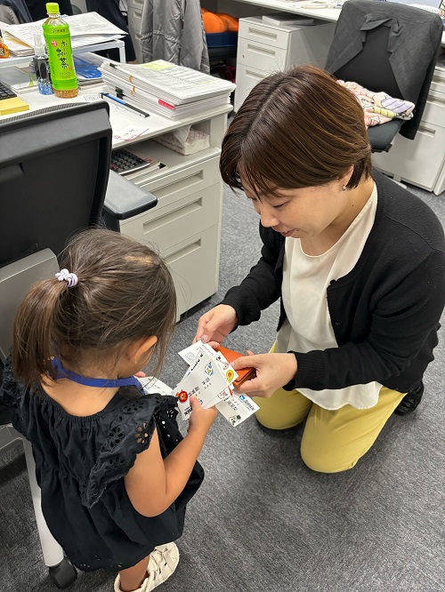 恒例の名刺交換も行いました。子どもたちが自分で作成した名刺を渡すと、受け取る社員も思わず笑顔になります。