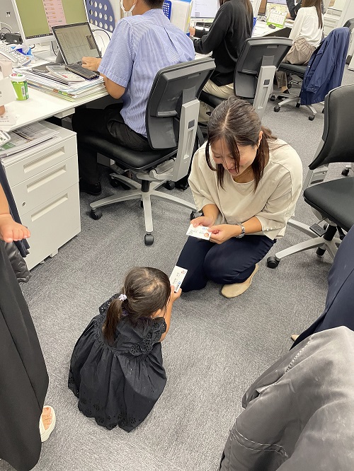 “子ども参観日”は社員のお子さんを会社に招き、実際に会社で働いている親の姿を見てもらうという企画です。子どもが親の仕事を知る機会をつくるのと同時に、職場でも育児についての理解を促すことを目的としています。