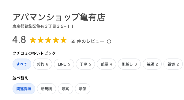 さらに、現在アパマン亀有店に関するGoogleの口コミも50件を超え、4.8の高い評価をいただいています。