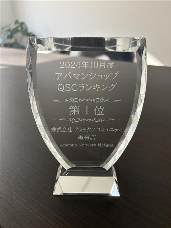 先日、お客様満足度向上を目的としたアパマンショップ独自の「QSCランキング」調査(QSC=クオリティ・サービス・クリーン)で、アパマン亀有店が200点満点を獲得したという知らせが届きました。