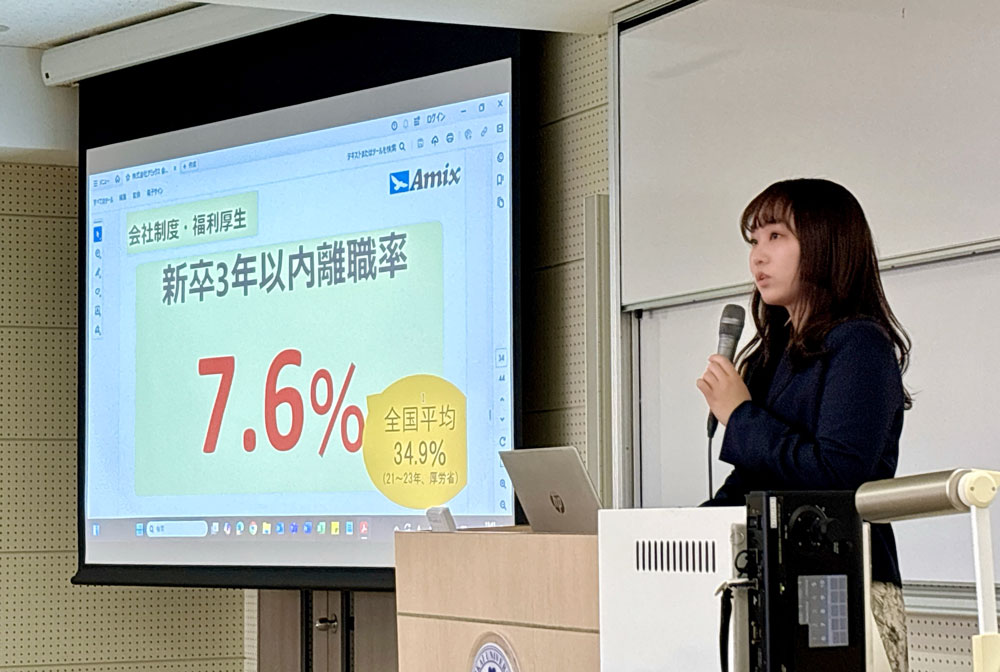 その後、総務部の女性社員より、アミックスの新卒採用についての説明を行いました。