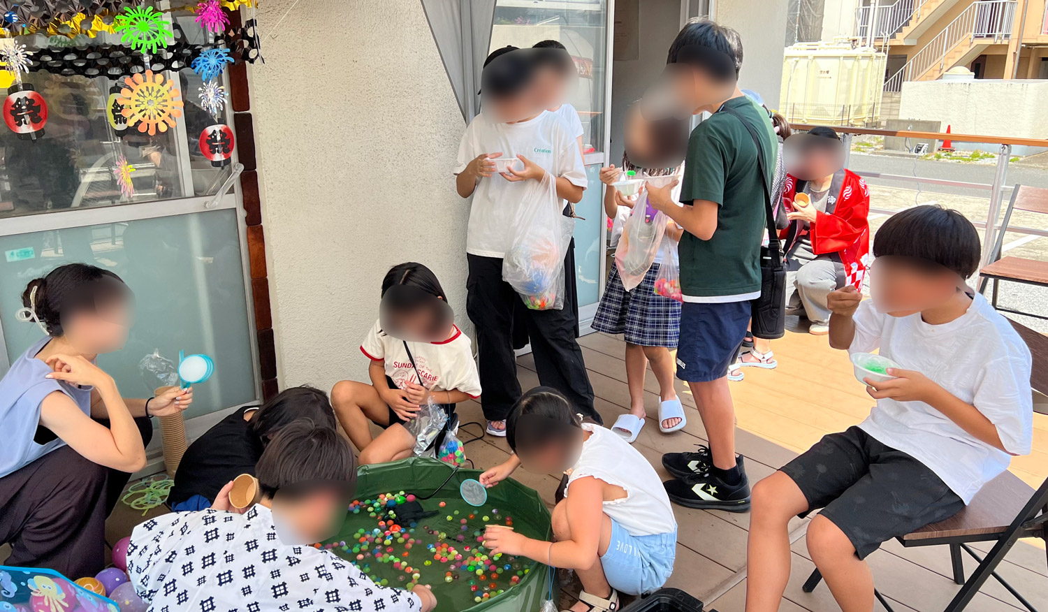 今年の「夏祭り」は、日曜日の午後に開催されました。スーパーボールすくいやヨーヨー釣りなど、お祭り定番の楽しいゲームコーナーに加え、たこ焼き、イカ焼き、フランクフルト、チョコバナナ、かき氷などの屋台も出店しました。