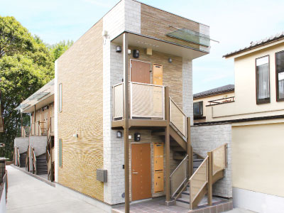 敷地が旗竿地(路地状敷地・敷地延長)でアパートが建てられないため、長屋建て(重層長屋)で集合住宅を建築しました。スペースを有効利用するため、「旗の持ち手」部分の土地にも、向きを変えて上下2戸の住戸を設置するなど効率的な設計になっています。