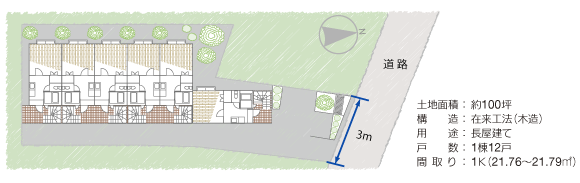 長屋建ては共同住宅に比べて建築基準が緩く、接している道路の有効幅員が2m以上あれば建築することが可能となります。