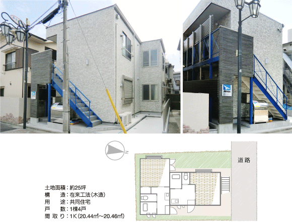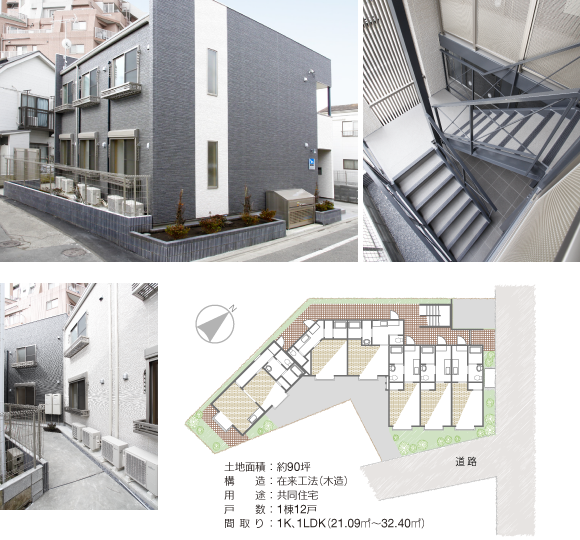 アミックスでは、アパート建築に不向きとされる狭小地・旗竿地(路地状敷地・敷地延長とも呼ばれます)・変形地などでも、土地に適した集合住宅形式の適用や設計の工夫などにより対応、これまでに多くの建築実績があります。