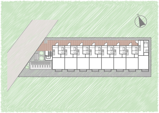 東京に隣接した埼玉県南部の開発地域。西側幅6mの道路に面した立地にカラーアズHタイプ1棟16戸を建築しました。
